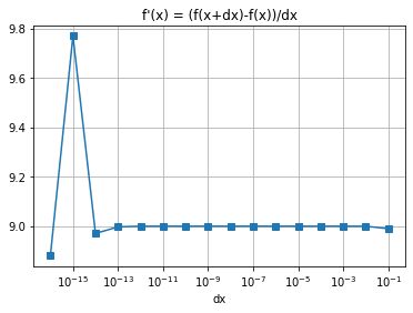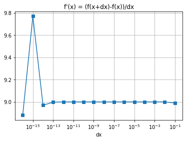 繪製如下右圖的折線圖,呈現 vs. “dx”,其中為了配合 dx 的大小,可以使用 matplotlib.pyplot.semilogx() 或調整 X 軸的格式為 ax.set_xscale(‘log’),否則會擠成一團。