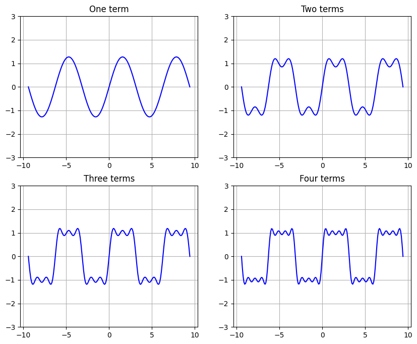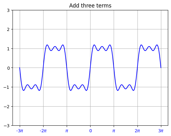 這個函數有無線項次,開始寫程式時,最好一項一項加進來執行繪圖,成功了,再來嘗試迴圈的做法。