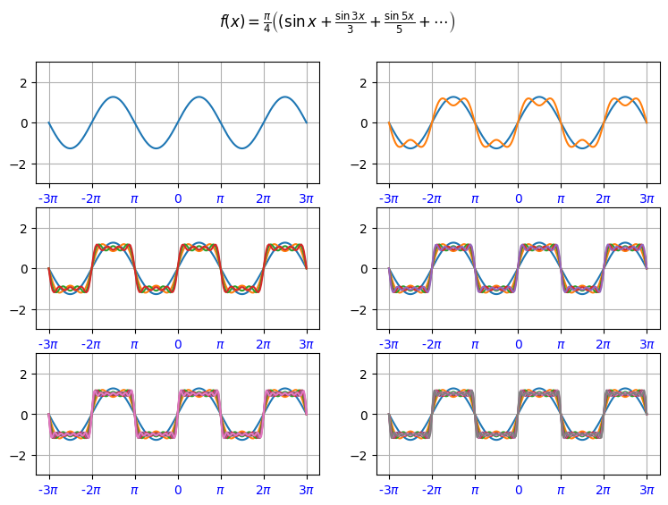 "$f(x) = \\frac{\pi}{4}\\left((\sin x+\\frac{\sin 3x}{3}+\\frac{\sin 5x}{5}+\cdots\\right)$"