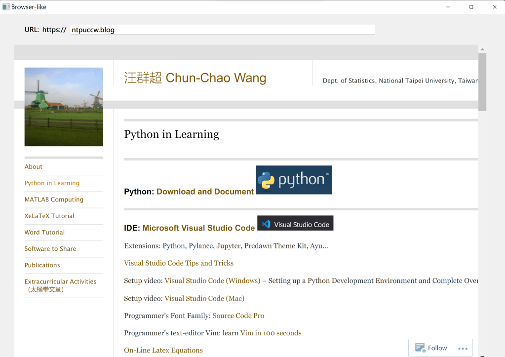 範例 4: 上述範例可以將 PyQt 呈現的地圖以網頁的型態儲存下來,代表 PyQt 有能力呈現一般網頁內容。本練習藉著 PyQT 介面做一個「類 Browser」,如下圖。