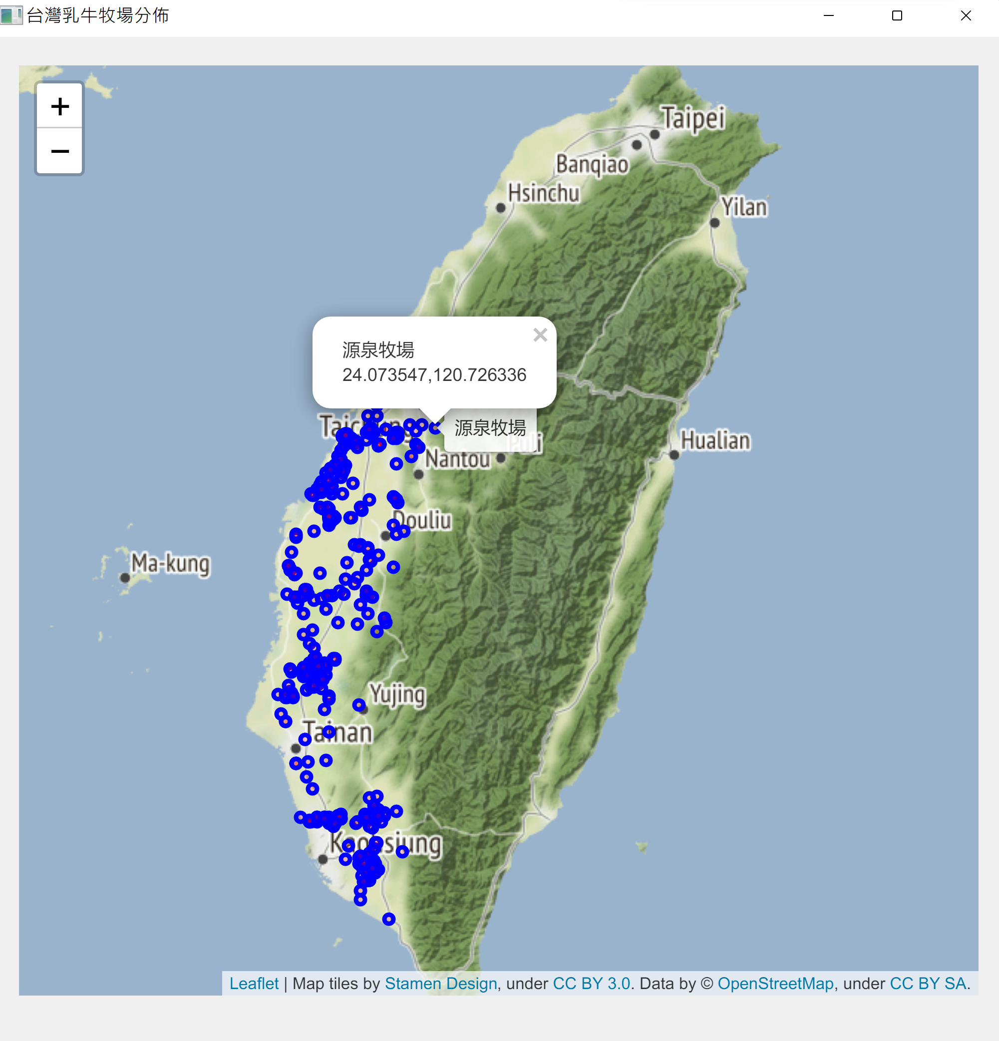 練習: 試著表現地圖呈現的樣貌。下圖呈現的是五百多家乳牛畜牧場的位置,其中圖標以圓形表示,滑鼠滑過圖標時顯示牧場名稱,點選圖標除顯示牧場名稱外,再加入緯度與經度,來表達不同的內容。