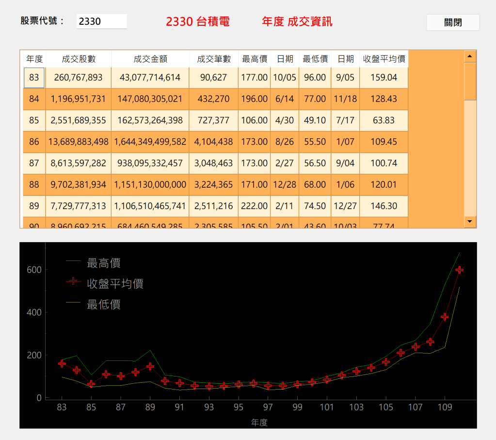 根據股票代號查詢個股的年成交資料並繪製圖收盤平均價、最高價與最低價的折線圖。