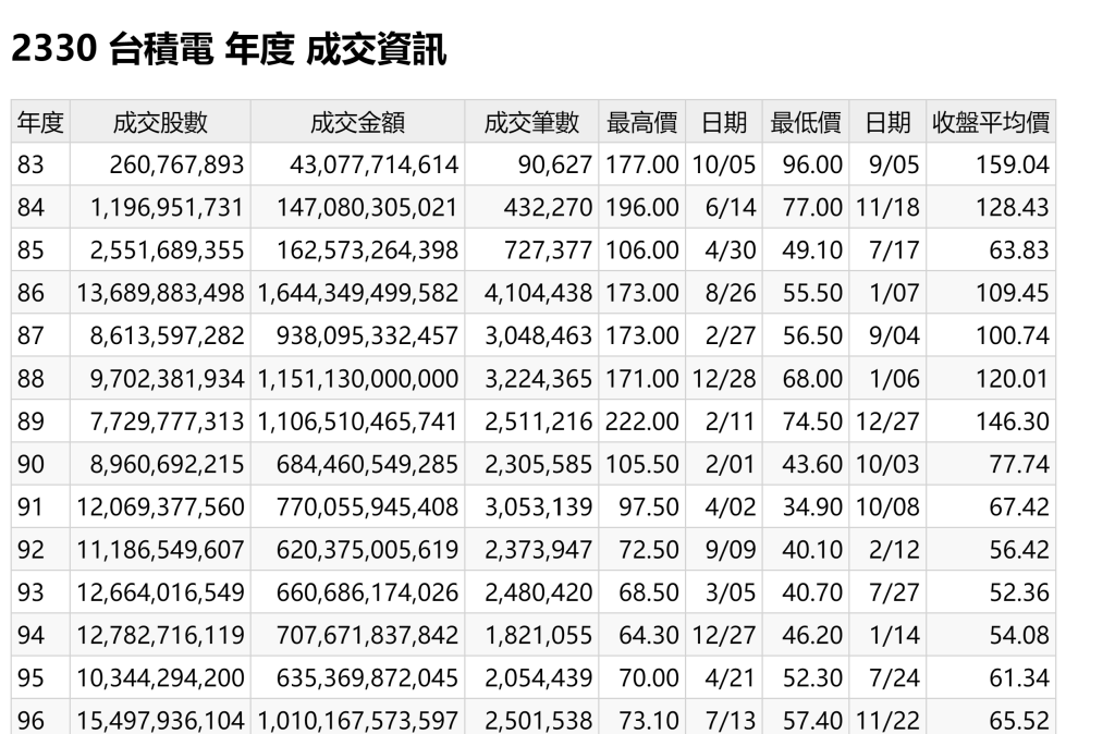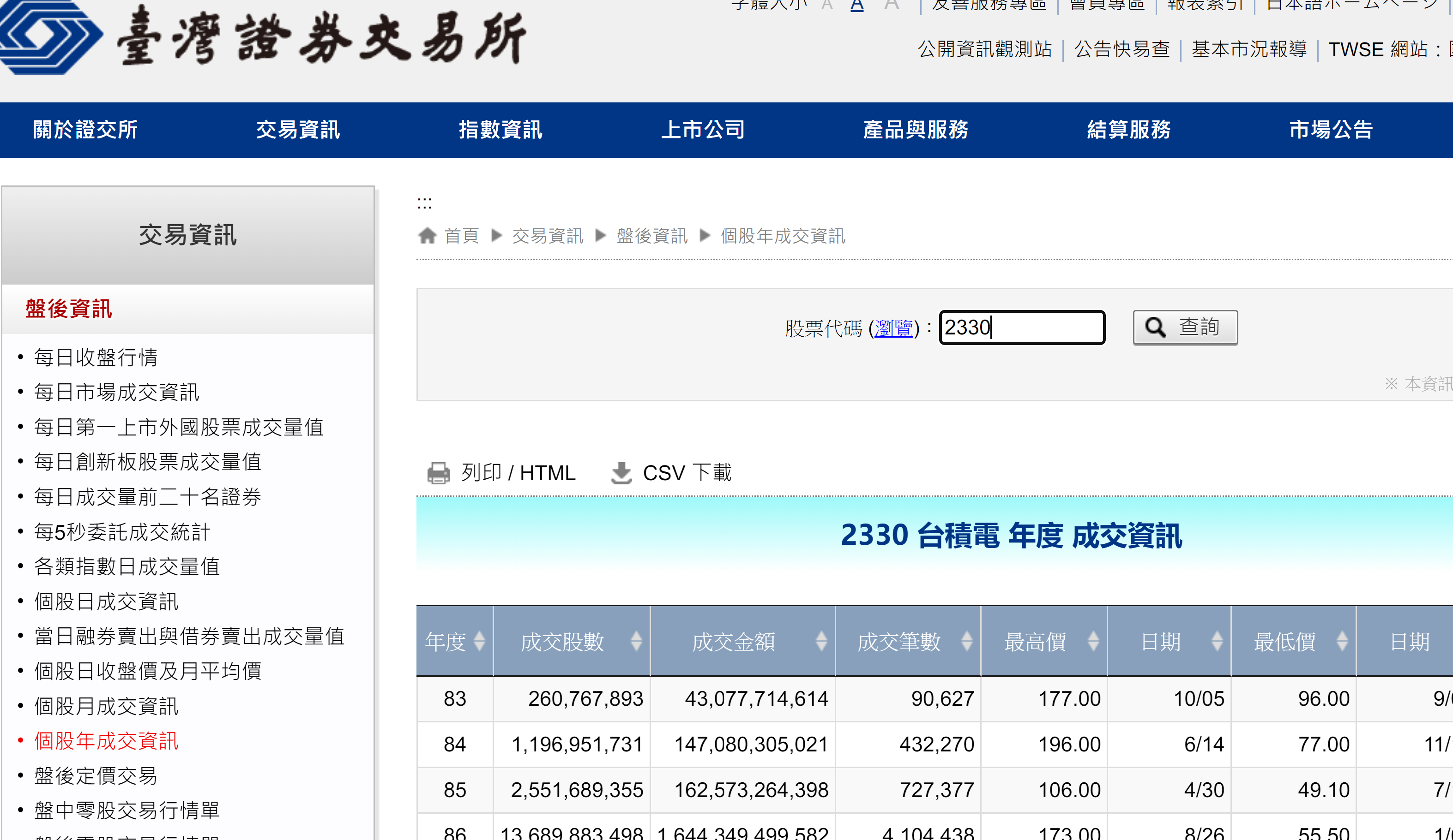 目標網址:台灣證券交易所之個股年成交資訊:https://www.twse.com.tw/zh/page/trading/exchange/FMNPTK.html