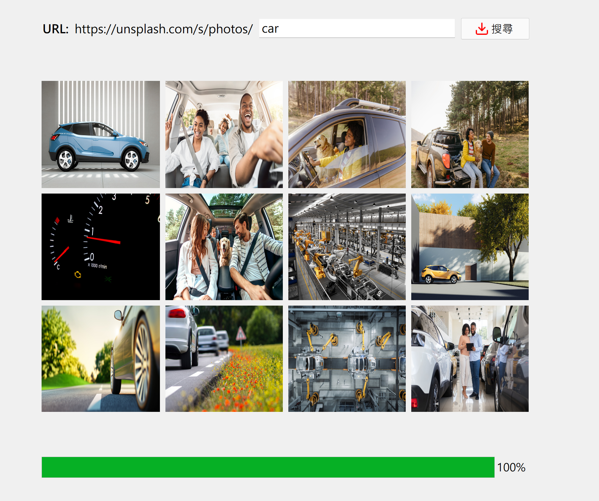下列的程式將圖片的連結(網址)一一挑出來,並發出 request 下載後,儲存在電腦裡。因為下載以 12 張為限,因此在迴圈裡製作一個 progress bar 以一張 1/12 的進度顯示。12 張圖下載並儲存完畢,最後再一張張呈現在 12 個 labels 裡,這個速度很快,因此才將 progress bar 放在下載與儲存這一端。
