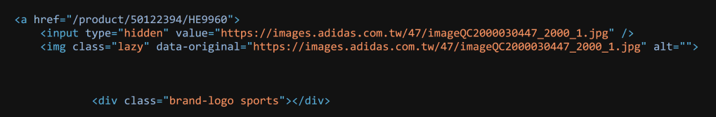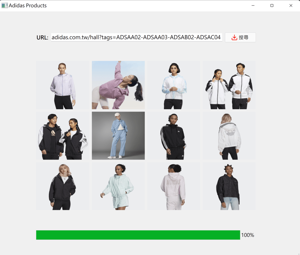 練習:前一個範例的 HTML 原始碼並不容易找到圖片所在。試試看愛迪達的官網產品網頁,譬如 https://www.adidas.com.tw/hall?tags=ADSAA02-ADSAA03-ADSAB02-ADSAC04 展示女性外套。這個網頁的原始碼較容易分辨,可以試著用關鍵字找到圖片的 html code。套用前面的程式碼,只需更動幾行即可。