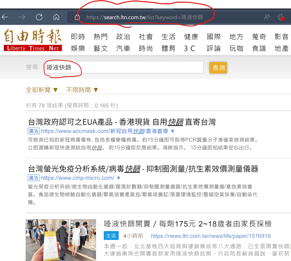 這個功能來自網頁本身提供的搜尋,如圖一,請留意觀察其搜尋結果的網址,譬如,關鍵字為「唾液快篩」:https://search.ltn.com.tw/list?keyword=唾液快篩。參照這個網址,尤其是前面那一段基底網址:https://search.ltn.com.tw/list?keyword=….,製作出如圖二的關鍵字搜尋。